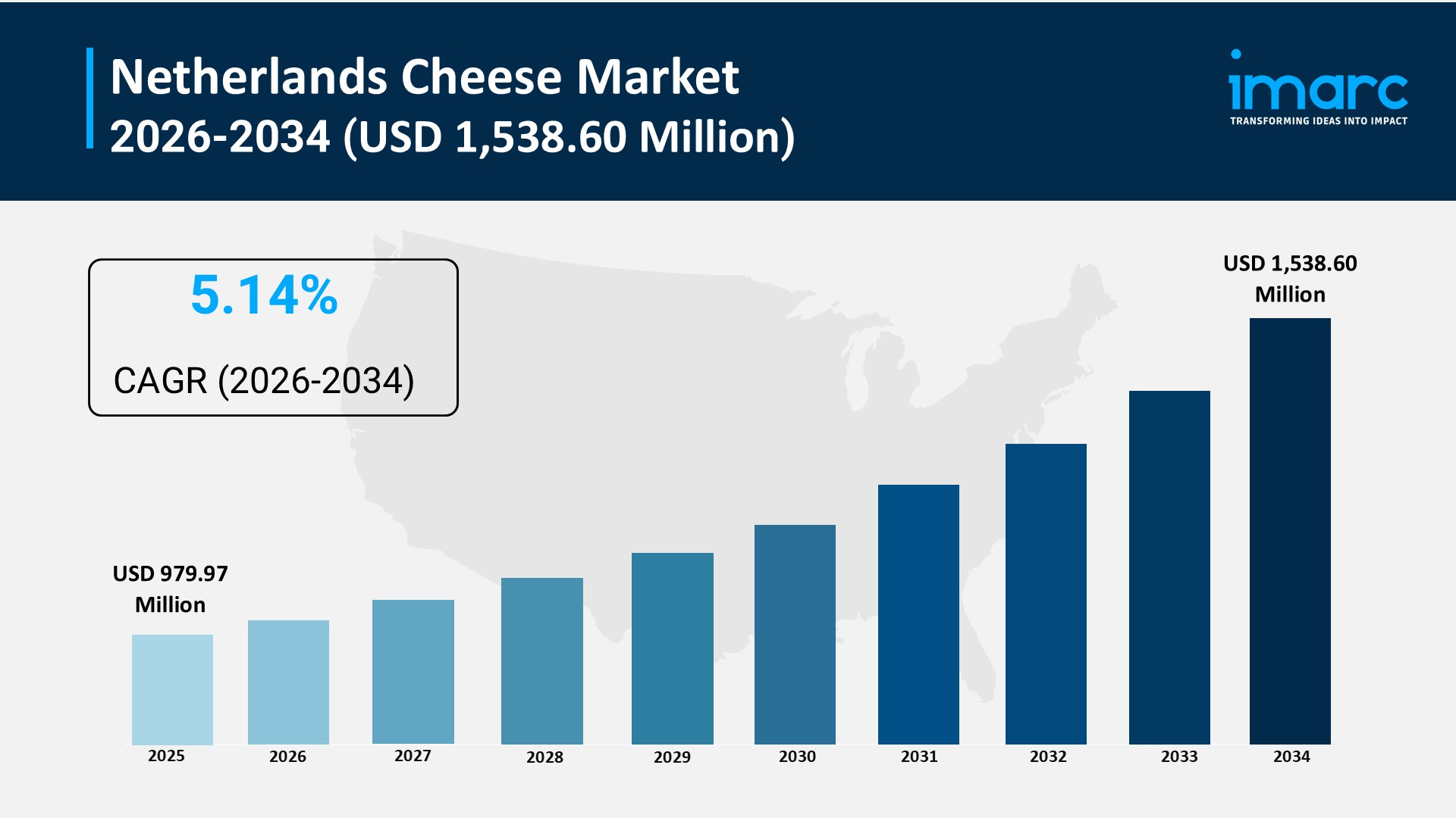 NETHERLANDS, March 11, 2026 /EINPresswire.com/ -- 𝐌𝐚𝐫𝐤𝐞𝐭 𝐎𝐯𝐞𝐫𝐯𝐢𝐞𝐰The Netherlands cheese market reached a valuation of USD 979.97 million in 2025 and is projected to expand to USD 1,538.60 million by 2034, representing a compound annual growth rate (CAGR) of 5.14% during the 2026–2034 forecast period. The market is driven by increasing domestic consumption and robust export performance, backed by continuous innovation in flavor profiles, product design, and hybrid cheese formats. Manufacturers are actively tapping into consumer demand for novelty and premium experiences, with heightening interest in specialty and gourmet products. The integration of traditional Dutch craftsmanship with contemporary culinary trends is enhancing product visibility both locally and internationally, creating a competitive and dynamic dairy industry landscape.