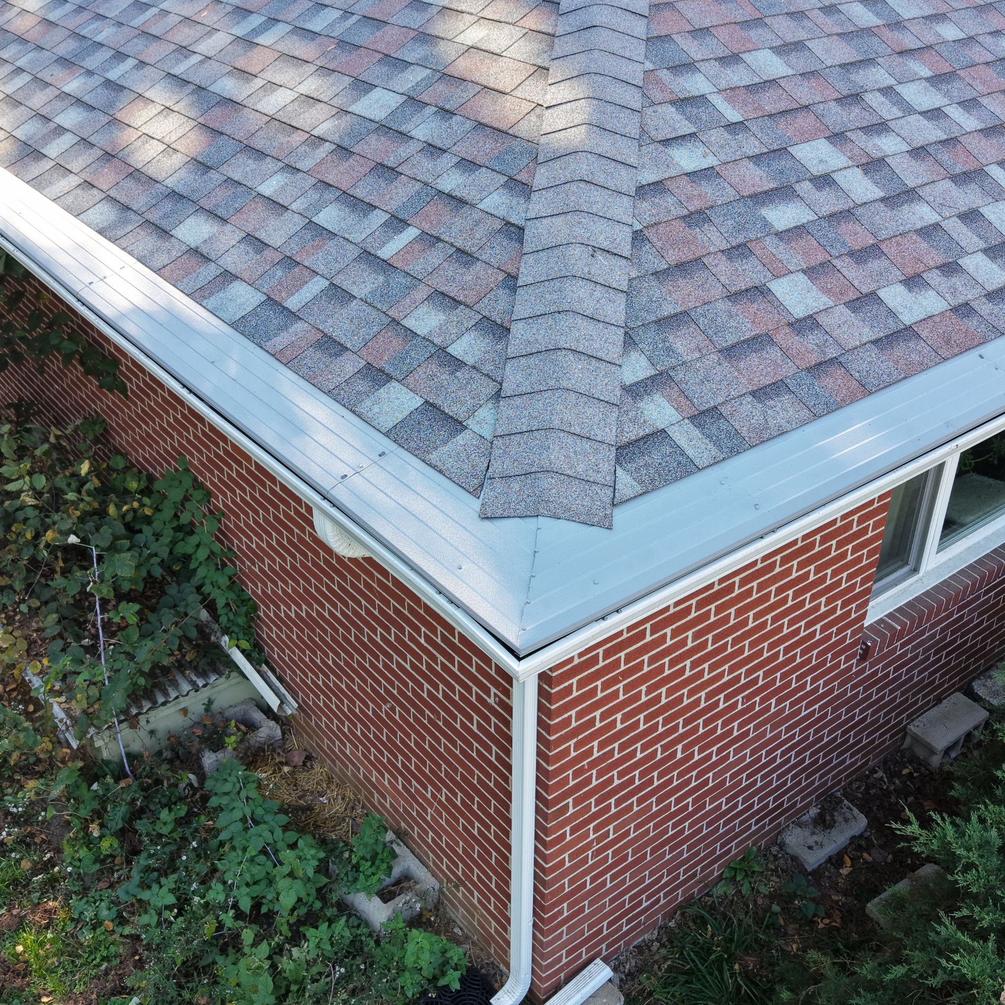 Aerial view of a newly installed architectural shingle roof with seamless white gutters and gutter guards on a brick home in Toledo, completed by All Exterior Solutions.